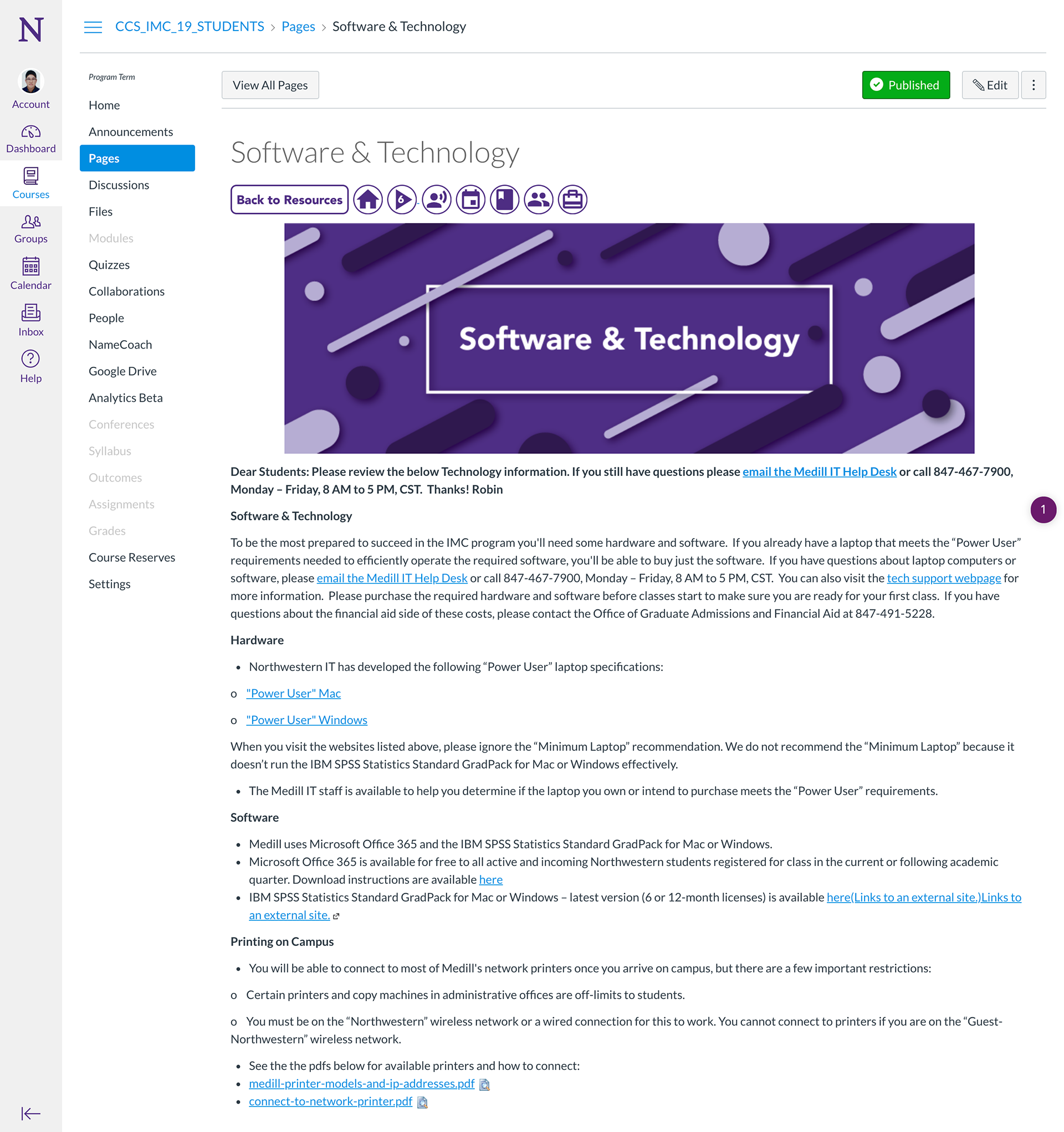 Since adopting its new LMS, Canvas, Northwestern University had largely removed internal resources from its official website. Instead, they have encouraged staff university-wide to move such content and resources to Canvas. The use and application of Canvas for such sites are varied school by school, department by department.